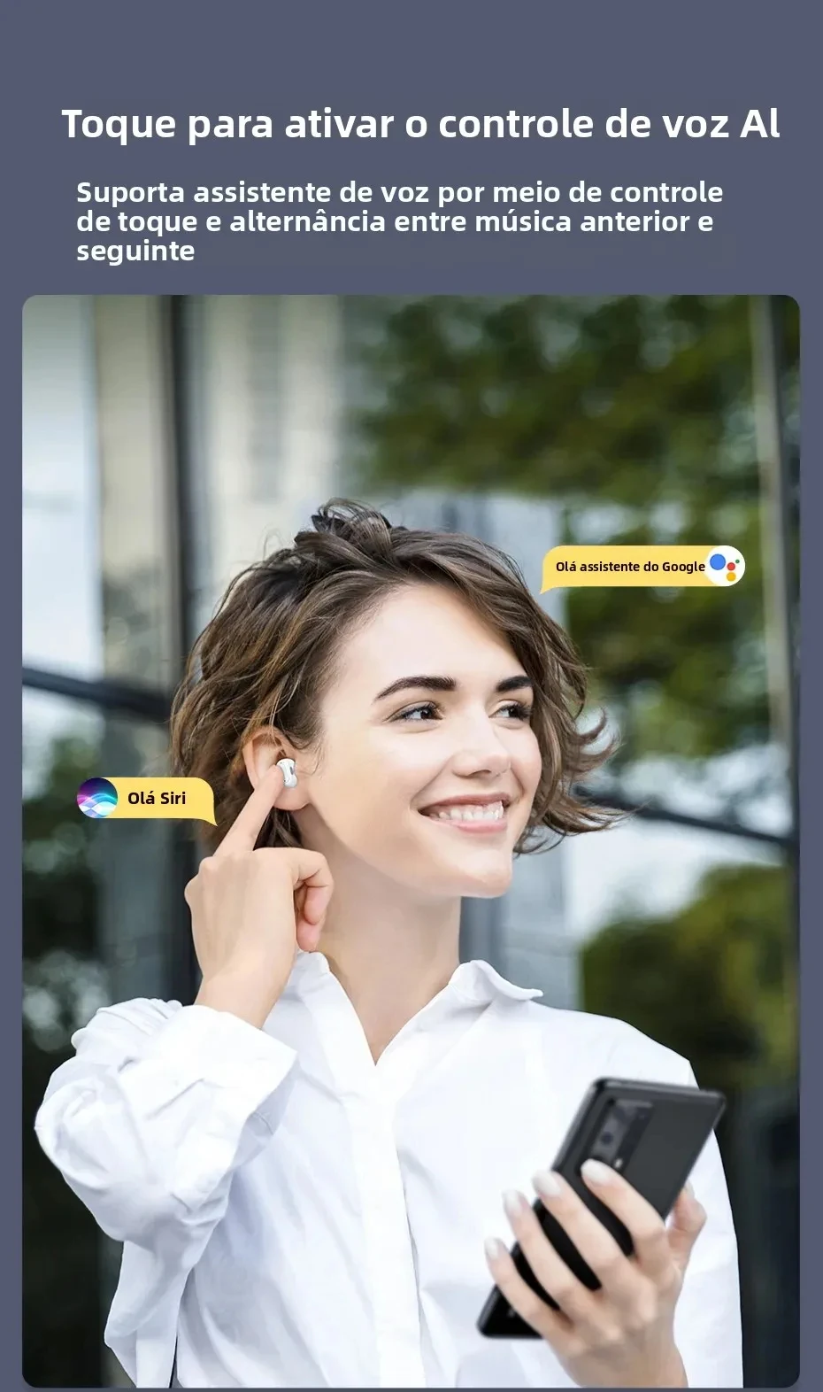 ✨ Controles de toque intuitivos: Reproduza, pause, mude músicas ou atenda chamadas diretamente pelo fone.